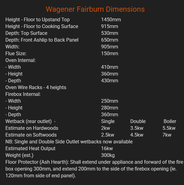 The Wagener Fairburn gives you a quality, New Zealand handcrafted woodrange at a very affordable price along with the bonus of self sufficiency through winter power cuts plus huge savings on your power bills.